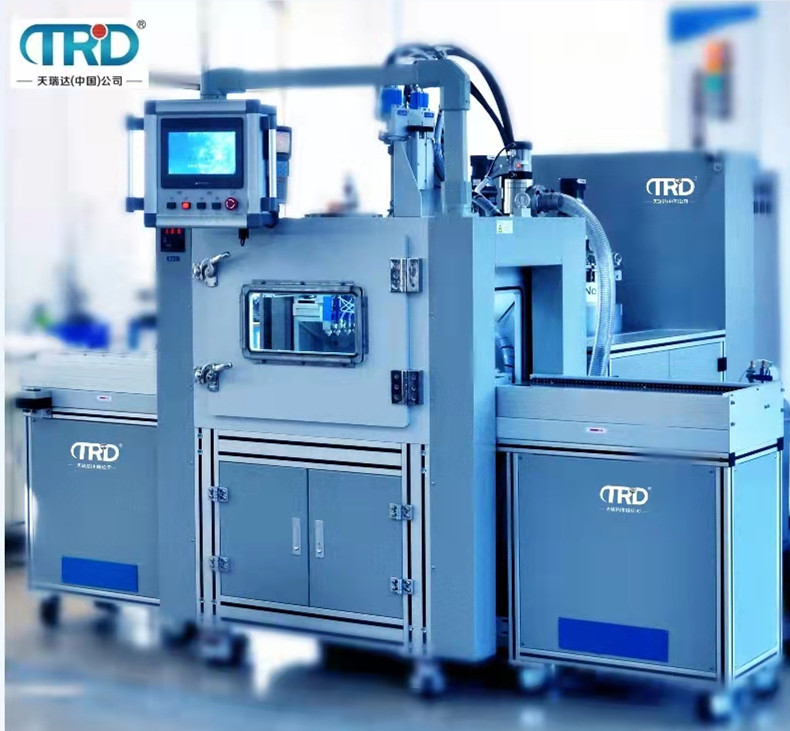 一,真空灌膠機的優勢:然而它的使用基本不受外界環境所干擾,所以設備性能穩定,注膠精度 高,運行可靠。而正是由于這些特性,相比在常壓下灌注,膠水貼度過高氣泡極難消除,產品內部有 氣泡膠水極難滲透,而導致灌出來的產品表面凹凸不平,性能更是相差甚遠。此時真空灌膠機的作用則可以體現出來,真空灌膠機是保持在絕對負壓狀態下對產品進行3-4次灌注的作業方式,利用負壓的作用力,在灌注過程中先將真空箱體內的空氣抽走,再進行產品灌注,能快速將膠水滲入到產品內部,灌注沖擊及膠水跟產品接觸產生的氣泡在負壓作用下也能快速抽走,從而保證產品的高性能。