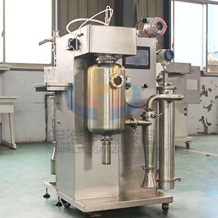 首先在開啟風機,加熱模塊,干燥塔體內(nèi)充入氮氣,要被干燥的液態(tài)物料經(jīng)輸液泵輸送至噴頭處,液態(tài)物料被霧化器霧化成細小液滴,液滴在干燥塔內(nèi)與熱氮氣進行充分的熱交換,物料中的液態(tài)部分被瞬間蒸發(fā),固態(tài)部分形成的粉狀物料沉于塔底,最后經(jīng)過旋風分離器進行氣固分離至物料收集瓶,溶劑經(jīng)過冷凝器回收,氣體循環(huán)利用。